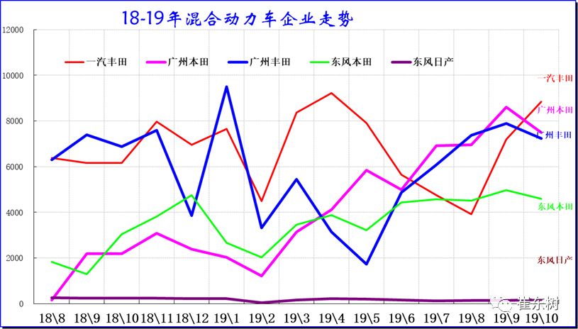 2018年到2019年夹杂能源通用车次要是日系车企浮现相对于良好。一汽歉田、广汽歉田成为发军。近期广汽原田浮现相对于良好,疾速成为发军。 春风原田的夹杂能源相对于稳健,混动种类跟着日系新品入进。 5.10月杂电动主力车型零售异比力弱
