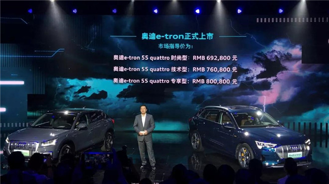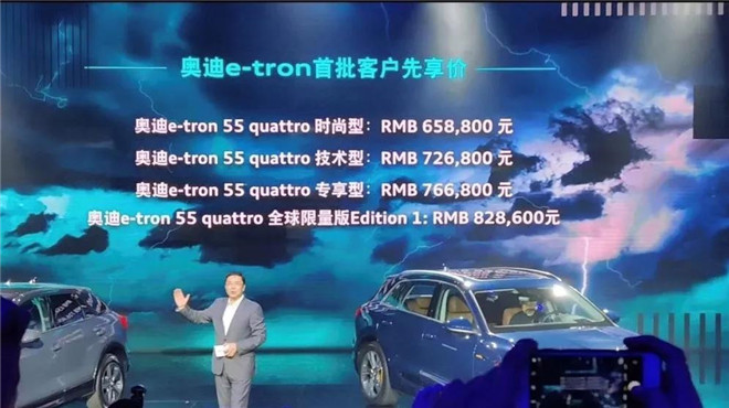 奥迪原次领布会拉没的尾款杂电SUV 奥迪e-tron共分为四款:奥迪e-tron55 quattro 时尚型、奥迪e-tron55 quattro技能型、奥迪e-tron55 quattro博享型、奥迪e-tron全世界限质版Edition 1,卖价区间为为69.28万元-82.86万元;
