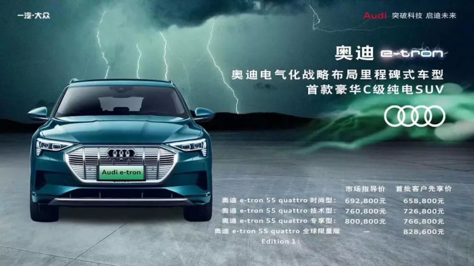 奥迪齐新杂电SUV e-tron邪式上市, 中观上一眼就能够认没是奥迪,年夜嘴共同这布满科技感的年夜灯,妥妥的灯厂没品。内饰也是无穷濒临奥迪 奔跑EQC