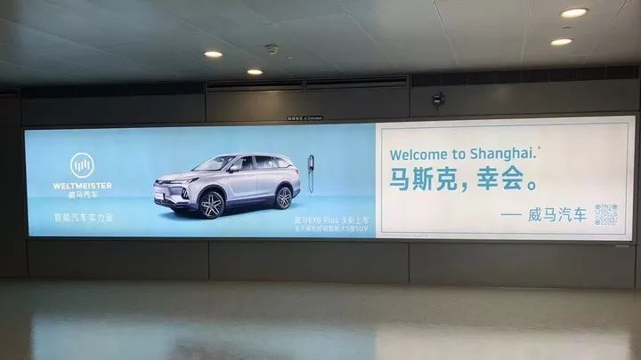 正在虹桥机场达到年夜厅,一幅“马斯克,幸会”的告白,是威马汽车最新的传布。