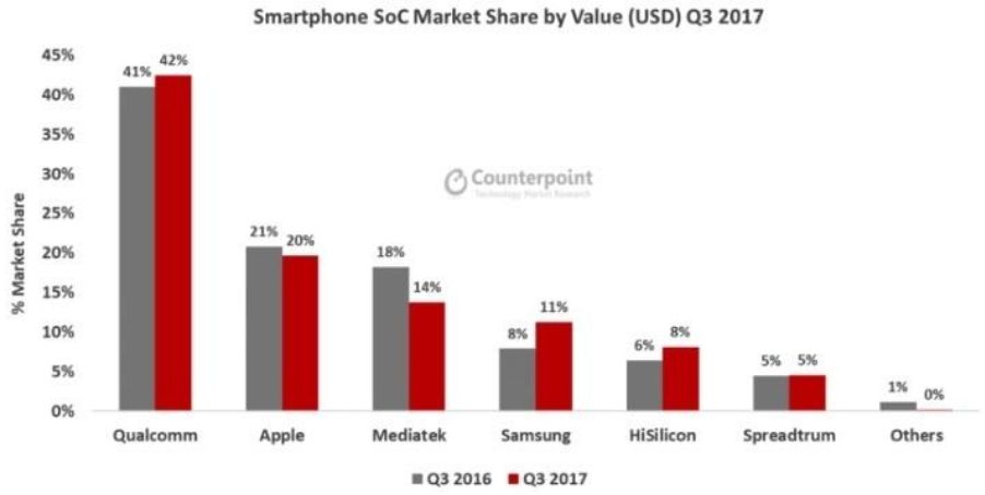 ▲ 全世界智能脚机SoC市场份额(2016-2017)