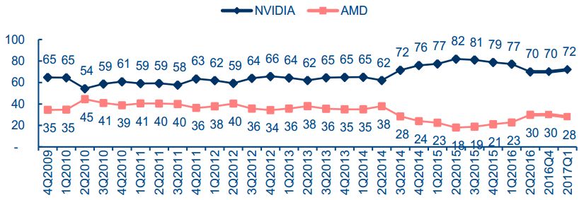 ▲ 全世界独隐GPU市场份额(2009-2017)