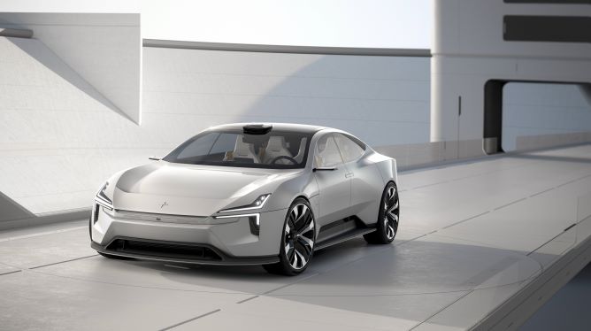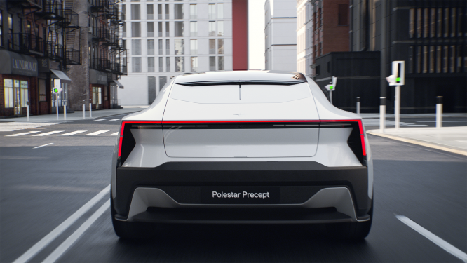 车身正面, 极星Precept的先后舷很是欠,轴距苗条(3100妹妹),车身上的线条也颇有雕塑感以及气力感,像是一款GT跑车。