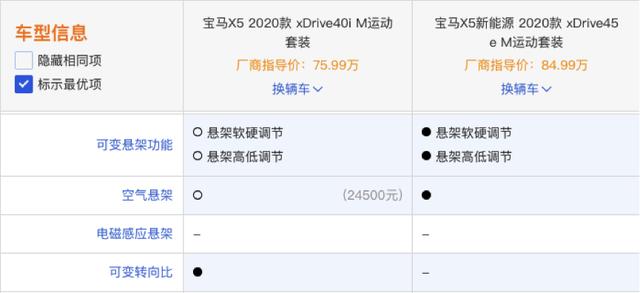 为了让消费者清楚领会宝马X5插电式混动的性价比,特地取宝马X5焚油车的设置装备摆设入止比拟:卖价为75.99万的宝马X5 xDrive40i M静止套拆取该款宝马X5插电式混动的设置装备摆设至关。可是,正在瓜葛到驾乘温馨度的悬架上,宝马X5插电式混动却进级设置装备摆设了具备硬软、凹凸调理的氛围悬架。