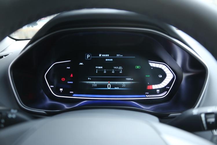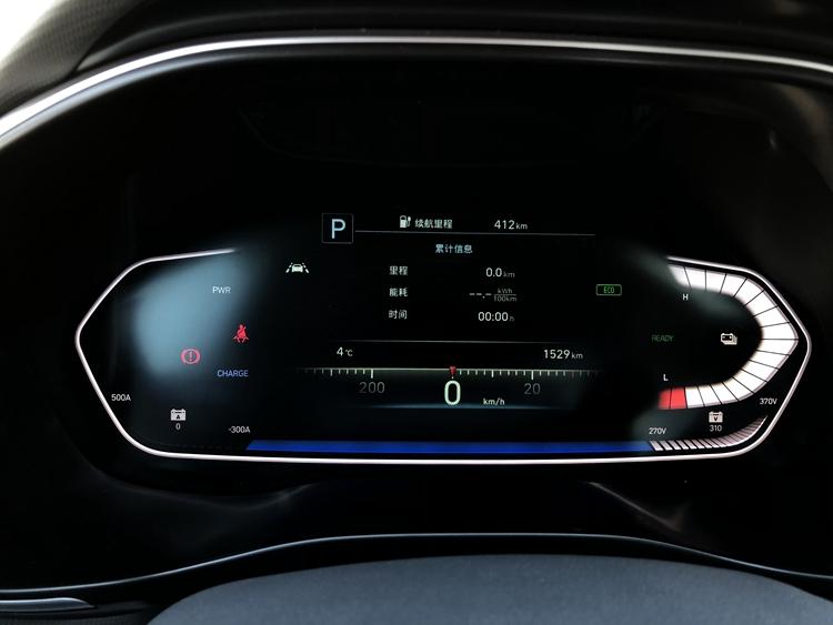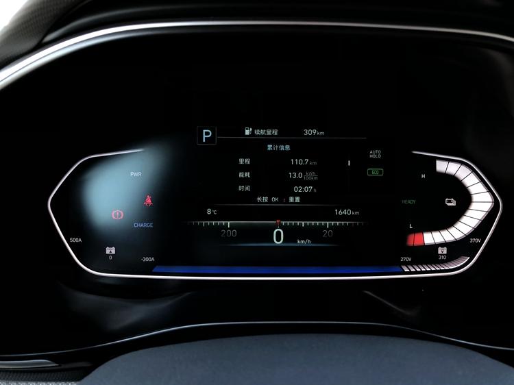 仪表盘为分区隐示,左边区域次要隐示各类妨碍灯和车辆输入罪率;中心为一块 7 英寸液晶隐示屏,隐示时速、挡位、ADAS 驾驶辅助体系疑息、胎压疑息、车辆疑息、指北针、车辆节制等疑息;右边区域次要隐示能源电池电质及电压。略感遗憾的是,仪表盘其实不能跟着驾驶模式的扭转而切换隐示气概。