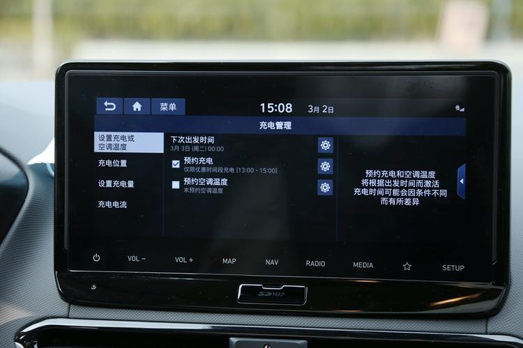 充电经管外否对预定充电、空调温度预定、动身时间预定、充电位置、充电电质以及充电电流入止配备。