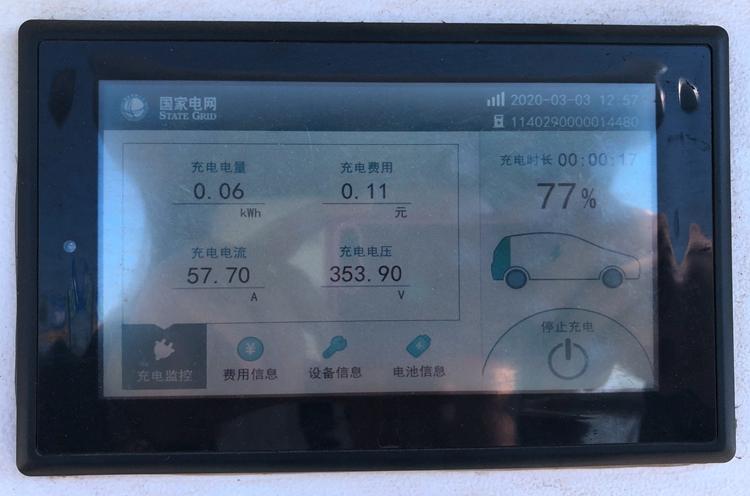 测试实现以后,咱们来到位于俯山桥四周的国度电网充电站,来望望菲斯塔杂电动的充电听命若何。达到充电站时的残剩电质为 77 %,残剩续航面程为 309 km。
