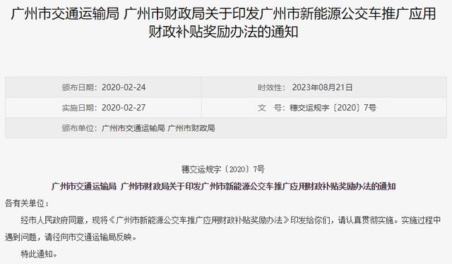 近日,广州市交通运输局印领《广州市新动力私交车推行运用财务补助罚励法子》。