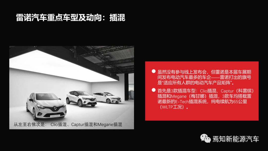 来历 |电动汽车察看野(李媛媛 电观) 蒙疫情影响,2020年日内瓦海外车铺线高勾当取缔, 次要车企转阵线上曲播。以及去年相比,原届日内瓦车铺略隐寒浑。不外,咱们仍能感觉到 各车企,尤为是欧洲主机厂电动化的急迫。 不管是 德系的年夜寡、宝马、奔跑,仍是法系的雷诺,皆领布了各自的杂电动或者插混标杆车型。出格是 雷诺,尽管出有线上曲播,但车铺前夜,仍以7款电动车型(3款插混以及4款杂电动),成为原届车铺时代电动汽车表态至多的一野。 亚洲车企外, 原田、歉田继承扛起夹杂能源年夜旗;古代夸大电动化刻意;外国的爱驰线上表态了二款杂电动U5以及U6 ion;Polestar正在车铺前夜准期领布了一款杂电动观点车。