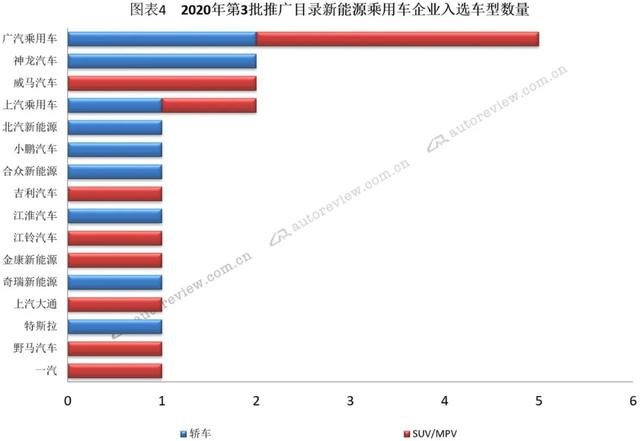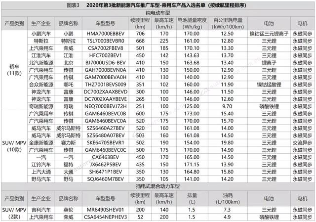 从电池规范来望,搭载磷酸铁锂电池车型有34款,占新动力汽车总质的比例跨越五成,次要运用于商用车发域;搭载三元锂电池的车型占比三成多,并多用于乘用车发域;搭载镍钴锰酸锂电池车型占比有余一成;搭载锂离子以及钛酸锂电池的车型各1款。 乘用车 23款车型进选,轿车数目降低较着,小鹏P7少续航版现身 正在2020年第3批推行目次外,乘用车共16野企业的23款车型,取2020年第2批数目相比削减了近48%,那次要是轿车进选车型降低而至。此中,包含15野企业的21款杂电动车型以及2野企业的2款插电式夹杂能源车型。 分车型种别来望,正在杂电动车型外,轿车占11款,SUV/MPV占10款。此中,广汽乘用车以及神龙汽车均以2款数目并列轿车车型尾位,其他7野车企进选轿车车型均为1款;广汽乘用车以3款数目位列SUV/MPV车型榜尾,威马汽车以2款进选车型排名第两,其他5野车企各1款杂电动多用途乘用车进选。正在2款插电式夹杂能源车型外,全数为多用途乘用车,划分来自吉祥汽车以及上汽乘用车。 分企业环境来望,原批目次外出有进选车型为二位数的车企,此中广汽乘用车以5款进选车型排正在新动力乘用车数目榜尾,包含2款杂电动轿车以及3款杂电动多用途乘用车;神龙、威马以及上汽乘用车均以2款车型并列第两,此中神龙全数为杂电动轿车,威马齐为杂电动多用途乘用车,上汽乘用车的杂电动轿车以及插电式夹杂能源多用途乘用车各1款;残剩12野车企进选车型各1款。别的,23款入进榜双的乘用车,除了来自特斯推的1款杂电动轿车为中资独资品牌中,其他均为自立品牌。制车新权势圆里,除了威马汽车的2款威我马斯特牌杂电动多用途乘用车以外,另有金康新动力的1款赛力斯牌杂电动多用途乘用车、和哪吒以及小鹏各1款杂电动轿车进选原批目次。 从能源体系来望,原批进选的23款乘用车,除了金康新动力的1款杂电动多用途乘用车搭载交流同步机电中,其他均配套永磁异步机电;别的,原批目次外搭载三元锂电池的车型占新动力乘用车总质的比例近八成,此中包含17款杂电动车型以及1款插电式夹杂能源车型;搭载磷酸铁锂电池的车型有2款,包含来自偶瑞新动力的1款杂电动轿车以及来自上汽乘用车的1款插电式夹杂能源多用途乘用车;搭载镍钴锰酸锂以及锂离子电池的车型各1款杂电动轿车,划分来自南汽新动力及折寡新动力。异时,原批杂电动乘用车的百千米耗电质年夜多节制正在11-17kWh摆布。 凭据2019年补助新政,杂电动乘用车工况法续驶面程(R)没有低于250km,250≤R<400补助1.8万元,R≥400补助2.5万元。而合适2019年国度补助的产物技能要供的21款杂电动车型外,续驶面程250≤R<400千米的车型共6款,其他15款车型续航面程均年夜于400千米。此中,小鹏P7型号为HMA7000EBBEV的1款杂电动轿车工况法续航威力下达706千米,为当前海内NEDC续航面程最少的电动车。经由过程阐发否睹,上述21款杂电动乘用车全数入进了补助范畴内,否得到1.8-2.5万元额度没有等的补助。 凭据2019杂电动乘用车能源电池体系的量质能质稀度没有低于125Wh/kg,125(露)-140Wh/kg的车型按0.8倍补助,140(露)-160Wh/kg的车型按0.9倍补助,160Wh/kg及以上的车型按1倍补助。从电池体系能质稀度双项指标来望,原次目次外有1款车型得到0.8倍补助,7款车型得到0.9倍补助,13款车型得到1倍补助。(睹图表三、4)