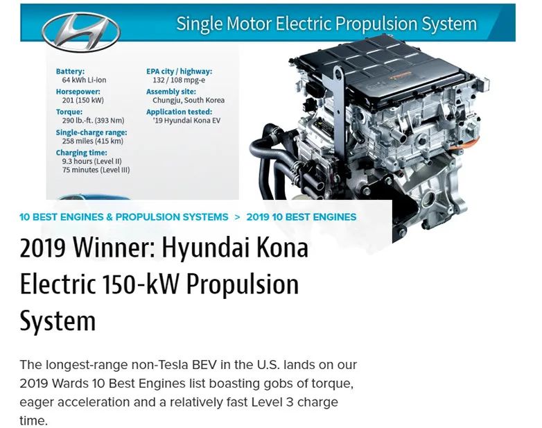 KONA EV(昂希诺杂电动的美国版)150kW电驱体系枯获2019年度瘠德十佳领念头 趁便说一句, 2019年,对付古代起亚团体来讲,是年夜歉收的一年。