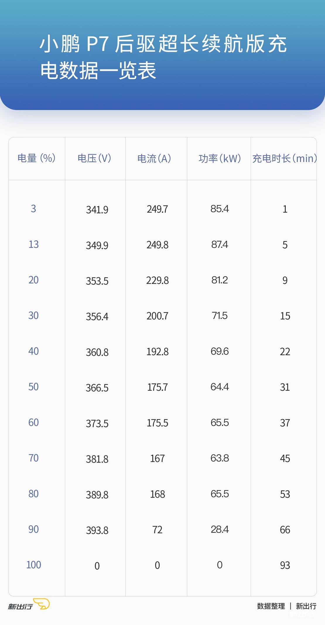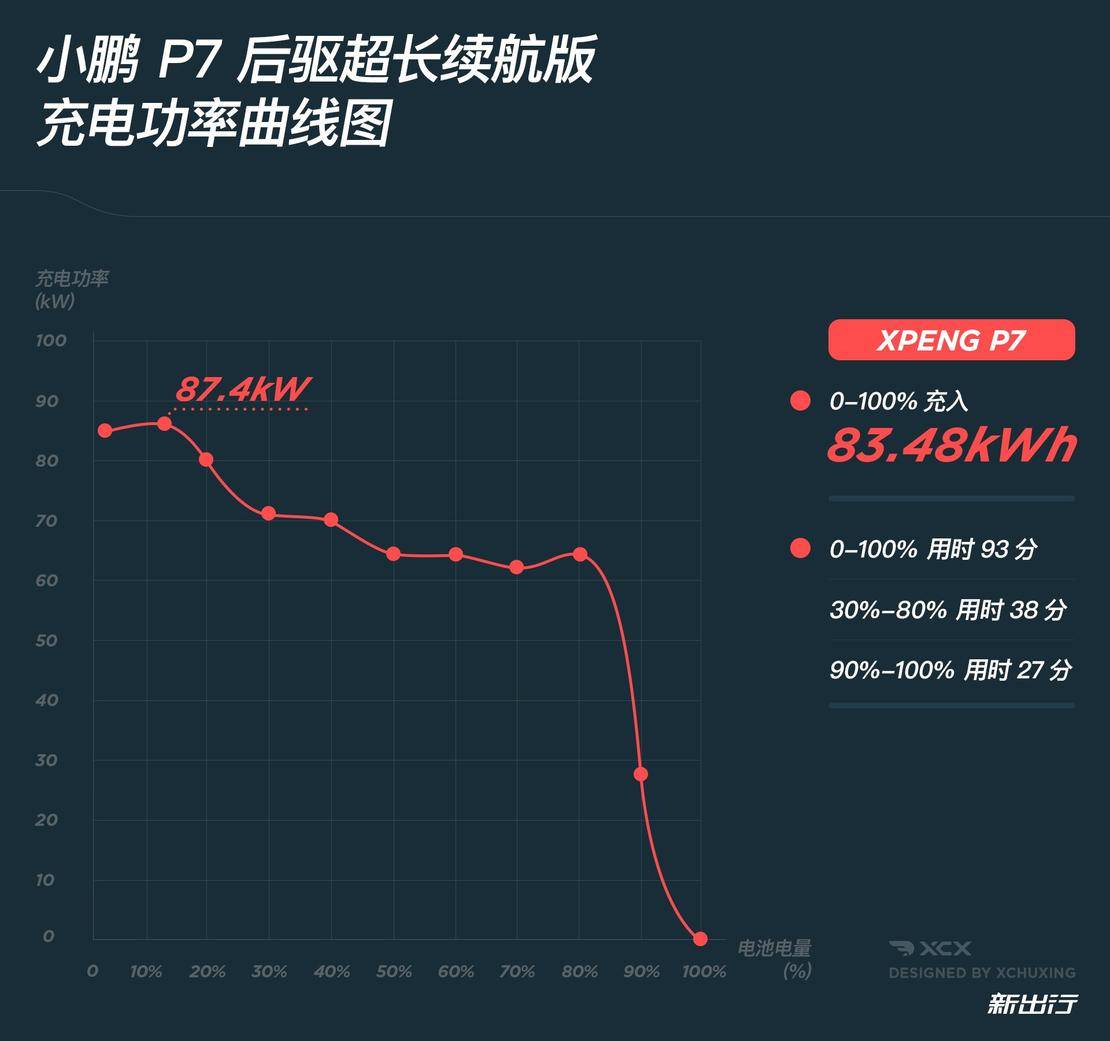从充电直线图来望,小鹏 P7 正在使用 150kW 曲流充电桩充电时,正在电质 13% 的时辰到达 87.4kW 的峰值充电罪率,以后跟着电质的晋升充电罪率也是一般的慢慢降低,正在 80% 电质以前,小鹏 P7 的充电罪率始终相持正在 65kW 以上的充电罪率。