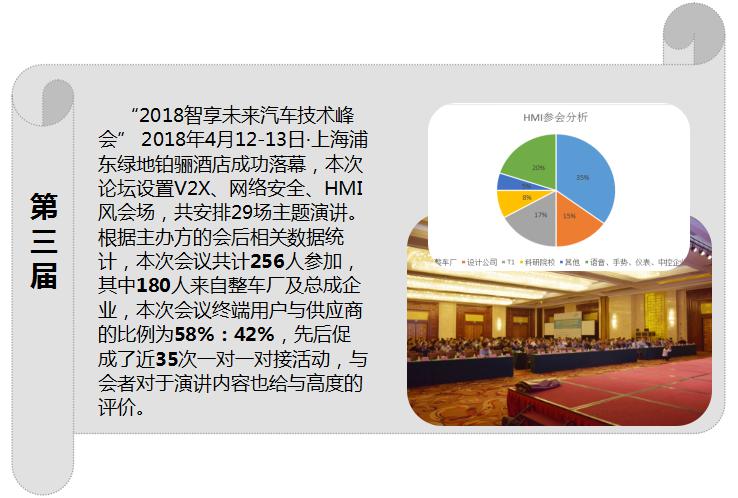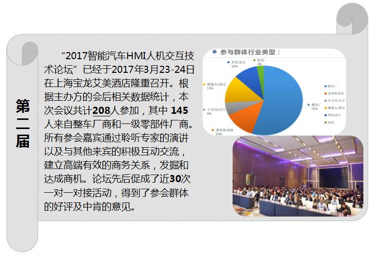 拉丰ATC成功举办三届HMI人机交互技术论坛,根据第三届的会后报告,论坛已聚齐业内知名整车厂商、汽车零部件集团、设计公司及供应链上下游企业等行业专家256人与会,论坛是国内最早且已成为国内规模最大,技术层次最高的技术峰会。 体验经济时代背景下,人们对美好生活的向往是无穷的,创新将永无止境。技术的进步正在帮助人们实现一个个愿望,汽车行业更是如此,智能化逐渐深入渗透到汽车,人与车之间的智能交互变得越来越重要,同时也符合现代智能化要求的用户体验。在科技与需求双驱动下,人机交互实现了多次革命,发展迅猛,人机交互设计也将成为智能汽车发展和创新的核心要素。语音、手势、生物识别、虚拟现实…未来智能汽车人机交互将为我们开启一个全新的世界。面对这样的改变和机遇,各企业该如何应对呢? 2019第四届智能汽车HMI人机交互技术论坛将汇聚300+来自世界各地的HMI、UX以及相关技术领域的专家深度剖析如何使用先进的HMI技术提升智能化时代下的用户体验。 我们诚挚邀请您的参与。 本届会议参会群体包含:整车厂商、系统集成商、IVI系统 、仪表供应商、语音控制方案供应商、触摸系统供应商、显示技术公司、HMI 设计方案供应商、UI 设计公司、UX设计公司、设计开发工具供应商、其用户研究调研机构、大学院校、、政府机构、其他等等 本届会议时间: 时间:2019年3月7-8日 地点: 中国.上海 规模:300 人 本届会议亮点: