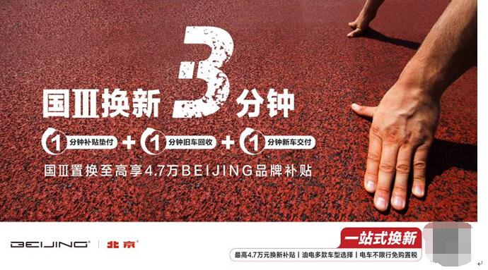 一重祸利:3分钟国III换新服务,省时省口 国III车主换买BEIJING汽车旗高车型,否享用“1分钟补助垫付+1分钟旧车收受接管+1分钟新车交付”一站式服务,省时、省力又省口。 一、 1分钟补助垫付:BEIJING汽车垫付当局补助,现场申请,当地支付; 二、 1分钟旧车收受接管:店内收受接管两脚旧车,代价公道,省时下效; 三、 1分钟新车交付:署理上牌、保险等营业,省往到车管所上牌的繁琐流程。 两重祸利:至下4.7万元换新补助,至关于7合买车