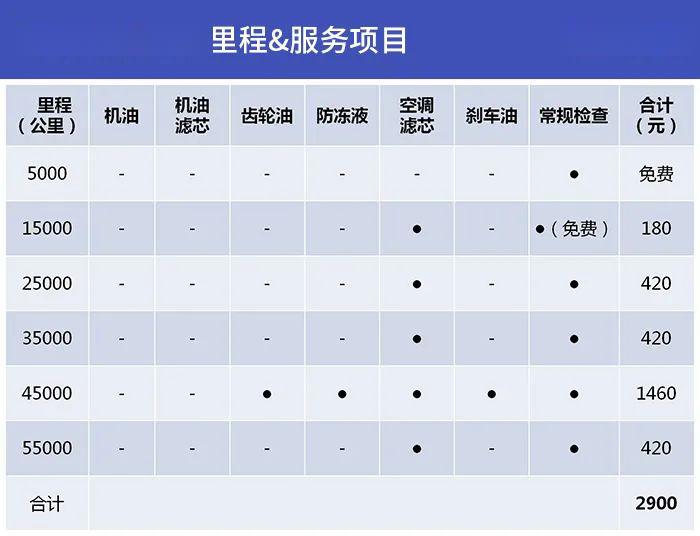 调养圆里,昂希诺杂电动的尾保面程为5000千米,以后的调养周期为1000千米调养一次,另中厂野为昂希诺杂电动提求了二次收费调养,此中第两次通例查抄收费,但改换配件的话仍需支费。从面程服务名目表格外否以得悉,昂希诺杂电动正在6万千米内的调养本钱共计为2900元。
