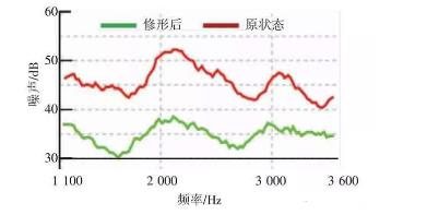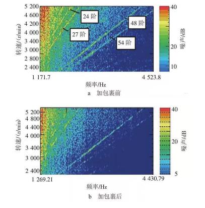 图11 某新动力车电驱总成添包裹先后车内噪声比拟 3 论断 |