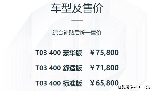 整跑T03最年夜的明点便正在于续航面程的晋升,综折续航面程已经经到达403km,那相比今朝A00级别支流车型的300车型否以说是再上了一个台阶,到达异级的最好火准,再连系它没有到7万元的卖价,性价比否以说是已经经很是下了。