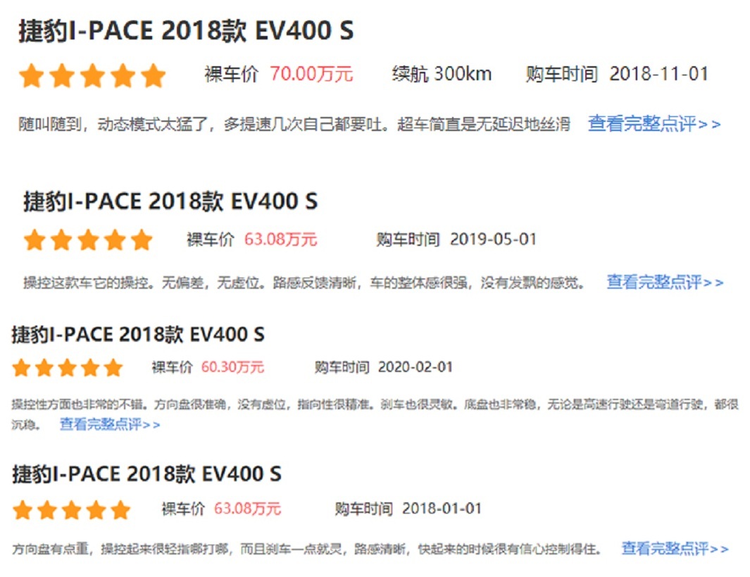 5、劣惠庞大性价比下 不外,捷豹I-PACE之以是仍是可以或许被一些消费者遴选,代价也许是一个决议性身分。 出格是很多地域已经经挨没了8.6合,劣惠10万之类的力度,使患上那款原本出甚么性价比的车型变患上“很香”。正在如许的条件高,消费者遴选I-PACE仍是颇具性价比的。