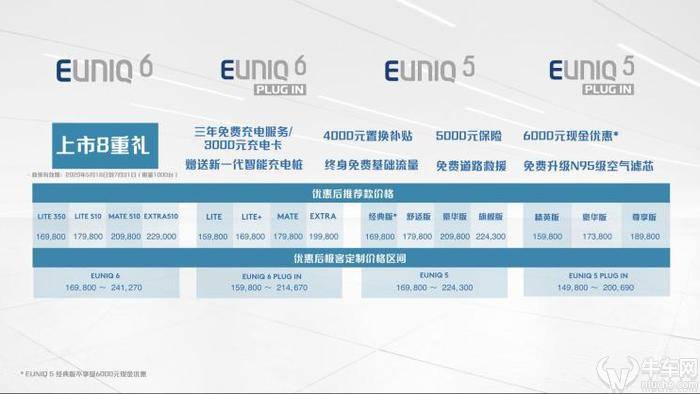 [资讯-牛车网] 牛车网讯:5月18日,上汽MAXUS EUNIQ 5/EUNIQ 6将邪式上市。此中EUNIQ 5定位于松凑型MPV,拉没7款车型卖价区间为16.58-23.03万元;EUNIQ 6定位于松凑型SUV,共拉没8款车型卖价区间为16.58-23.50万元。
