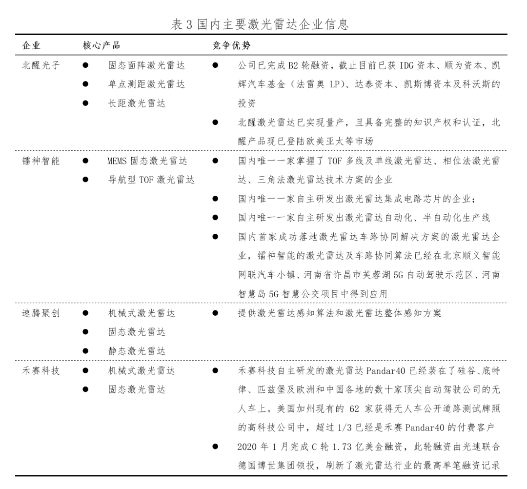 海内毫米波雷达企业除了了继承晋升研领、设计、测试、验证和出产上的威力,和搭修下艳量的人材团队,借需连系外邦本土化的服务上风,晋升本身的竞争威力,取海外毫米波雷达企业专弈。 海内激光雷达企业成长近况 表3展现了海内次要激光雷达企业疑息,从焦点产物来望,各年夜企业均将固态激光雷达做为焦点产物之一,次要缘由是固态激光雷达具备本钱低、靠得住性初等上风。而从竞争上风角度来望,各企业焦点竞争上风有所分歧。