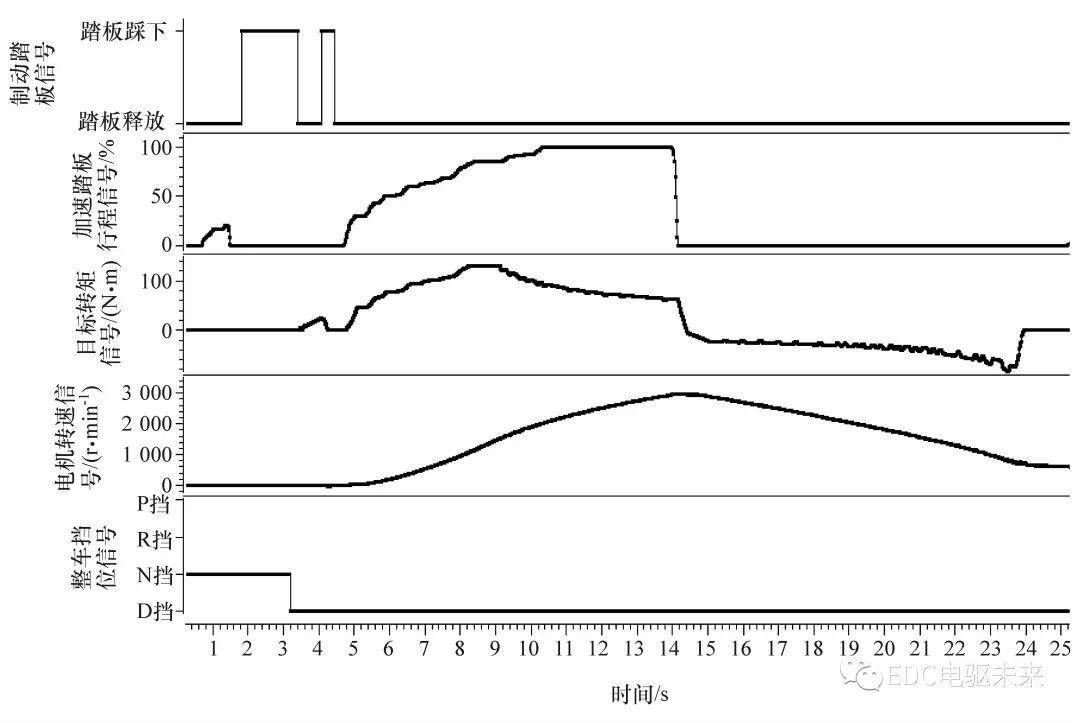 图5 转速 归馈转矩特征直线 造动能质归馈测试直线如图6(a)所示。造动踩板有用时,转矩疾速升至负值,入进造动能质归馈模式,机电转速降低。滑止能质归馈测试直线如图6(b)所示,加快踩板止程降低至0时,入进滑止归馈模式,转矩疾速升为负值,机电转速降低,待转速升至较小值后,转矩迟缓回升恢复至0。零车驾驶驱动节制战略能正确相应驾驶员用意,并正在滑止以及造动进程外收受接管能质。