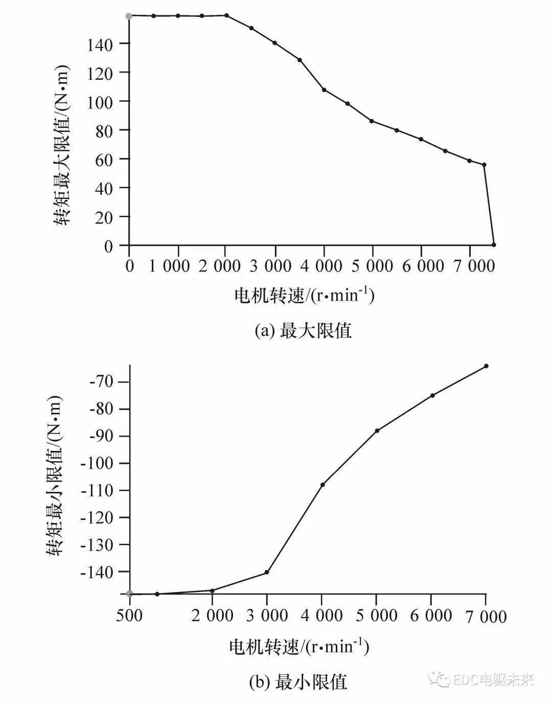 图6 滑止、造动能质归馈测试直线 4.2.3 分歧工况的转矩腻滑处置 凭据分歧驾驶工况,划分对转矩入止腻滑处置,分歧机电转速高机电转矩的最年夜、最小限值划分如图7(a)以及图7(b)所示,经由过程标定知足VCU的能源性、温馨性以及经济性要供。