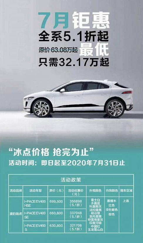 日前,咱们从上海一野经销商处获悉,正在上海地域,捷豹民间颁布发表旗高杂电动车型I-PACE劣惠5.1合起,扣头后新车的卖价区间为321708~356898元,堪称名不虚传的“炭点”代价,不外那个代价仅延续到7月31日。