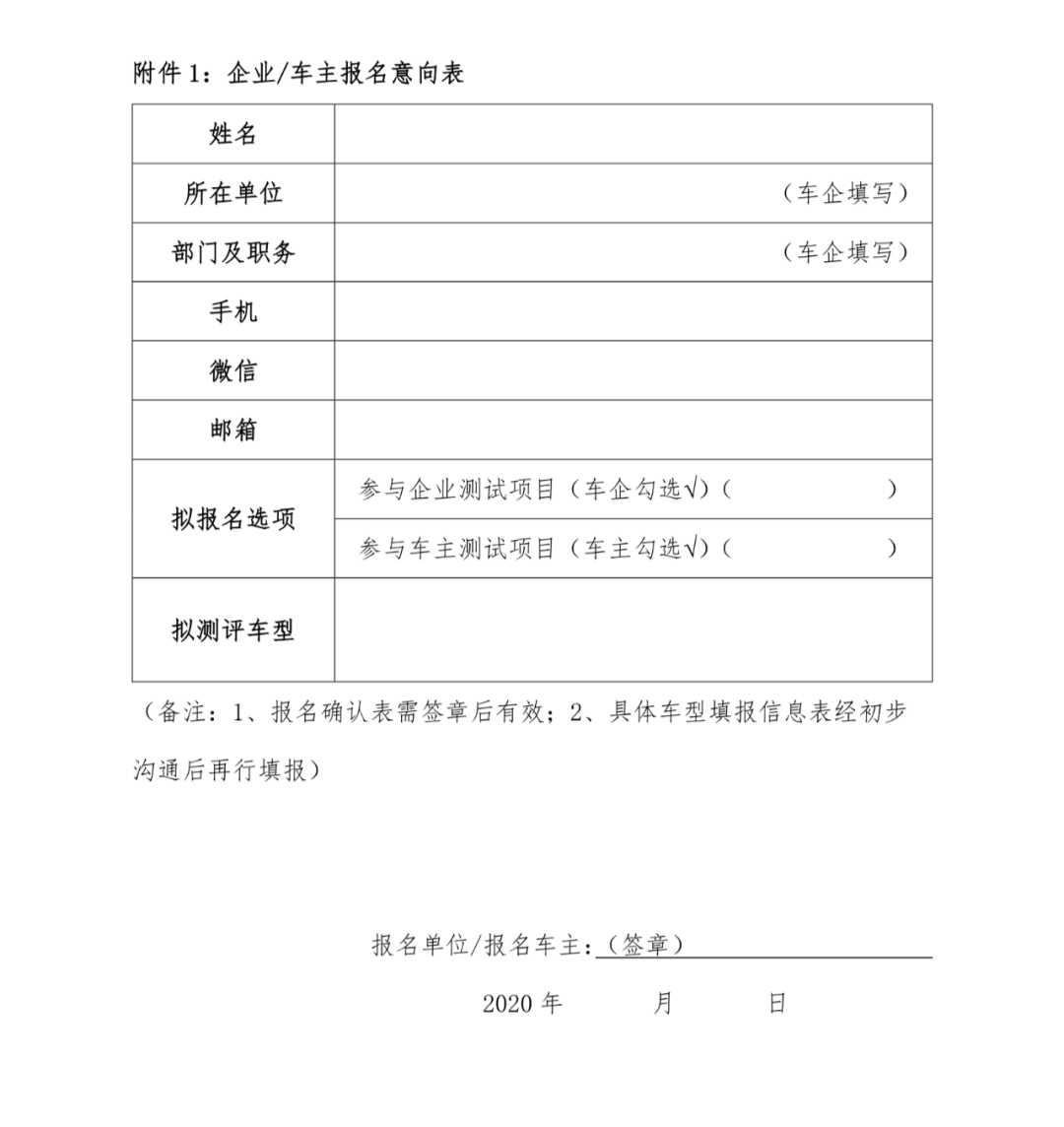 零车企业、车主早期报名经由过程微疑或者邮箱快速报名,报名必要挖写姓名、所正在单元及职务、脚机、微疑、邮箱、报名选项等根本疑息,联结事情组支到相干疑息后将第且自间跟入并沟通参测的后续事宜。 07 原次勾当终极诠释权回车联网平安联折试验室一切。 08 附件浑双 附件1.企业/车主报名表