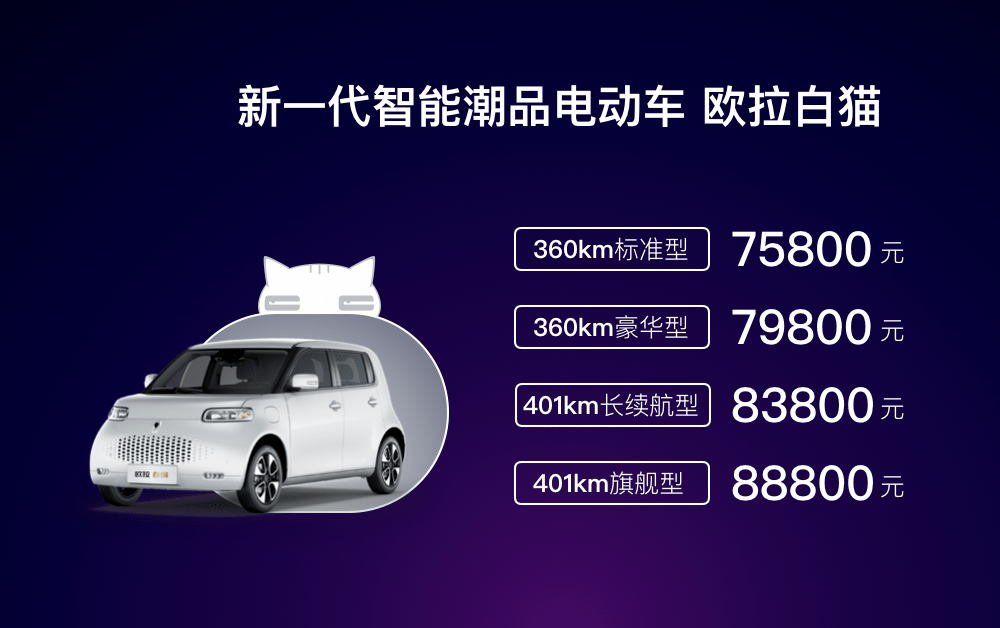 欧推皂猫是少乡汽车旗高新动力品牌欧推汽车第三款齐新车型,其补助后卖价为7.58-8.88万元,划分拉没NEDC综折续航面程为360km以及401km二种续航版原,另中提求4款分歧设置装备摆设车型否选,划分为360km尺度型、360km奢华型、401km少续航型和401km旗舰型。