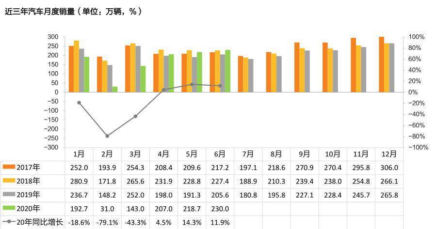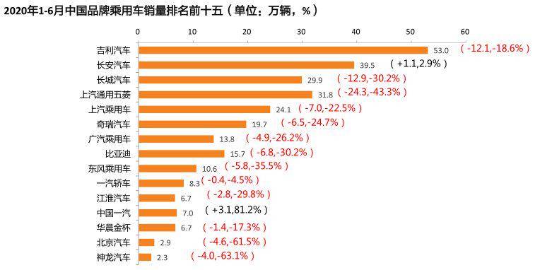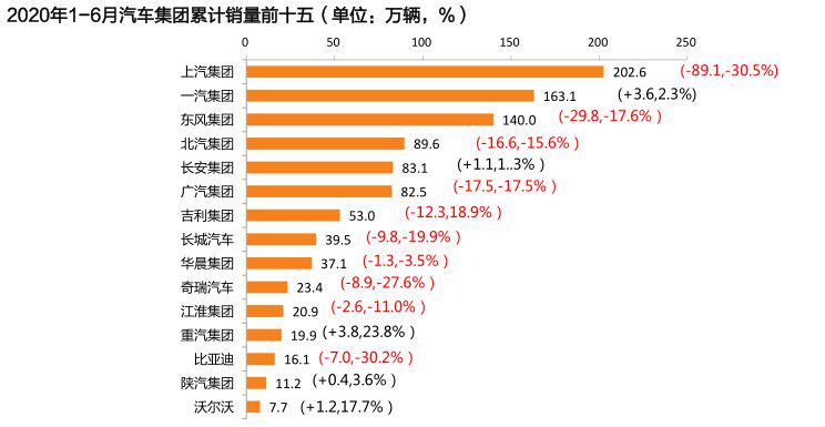 2020年1- 6月汽车累计销量前三名汽车集团分别为上汽集团、一汽集团和东风集团。销量分别为202.6万辆、163.1万辆和140.0万辆。其中,上汽集团比去年同期累计下降30.5% ,一汽集团比去年同期累计增长2.3% ,东风集团比去年同期累计下降17.6%。 2020年1-6月中国自主品牌乘用车累计销量前三名汽车品牌分别为吉利汽车、长安汽车和长城汽车。销量分别为 53.0 万辆、39.5 万辆和29.9 万辆。其中,吉利汽车比去年同期累计下降18.6% ,长安汽车比去年同期累计增加2.9% ,长城汽车比去年同期累计下降 30.2%。