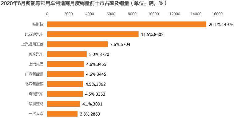 二.新能源汽车产销及格局 中汽协数据显示,6月我国新能源汽车产销量双双“10万+”,分别完成10.2万辆和10.4万辆,同比分别下降了25.0%和33.1%,但延续了上一个月的环比增长趋势,分别增长了21.3%和26.8%。没有去年同期剧烈的补贴调整等因素干扰,因此今年下半年新能源汽车市场或迎来高增长的良好局面。 我国新能源汽车市场结构也悄然发生改变——此前以国内自主品牌为主导的局面正在消失,取而代之的是多方势力同台竞争。本土造车新势力佼佼者蔚来的6月销量达到3740辆,同比大增179%;威马销量为2028辆,环比上涨35%,实现了连续4个月的增长。作为外资品牌的特斯拉也不甘示弱,在5月成为中国新能源汽车市场霸主后,6月继续高歌猛进,在纯电动市场销量份额达到23%。