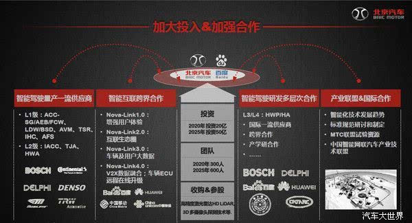 2017年CES国际消费电子展正在举行,从北京汽车官方了解到:当地时间2017年1月6日,北京汽车股份有限公司与百度携手,在2017美国拉斯维加斯CES展上宣布:双方在智能汽车领域达成全面战略合作,共同致力于推进未来汽车智能化升级。 北汽集团总经理张夕勇表示:“北京汽车与百度智能汽车的战略合作,将推动双方在智能化领域的技术升级,为智能汽车产业未来的发展做出表率。” 本次北京汽车与百度智能汽车的签约协议中,双方将在智能汽车、车联网、L3 级智能驾驶、高精度地图及车载地图、联合品牌运营等领域及建立战略合作关系,实现合作领域技术开发、市场应用、资源信息共享、优化和共同发展。 合作主要包括以下几个方面的内容: 高精地图深度合作;基于百度 CarLife、MyCar 及 CoDrive 等智能汽车解决方案应用;基于L3 级智能驾驶技术的深度合作;建立联合实验室; 品牌与产品营销;以及云平台和大数据技术等。双方将开展L3级自动驾驶技术与高精度地图合作,并将在2017年推出搭载车联网解决方案的车型,年内还将进行北汽L3级自动驾驶车型的路测。 在发布会上,北京汽车还公布了名为“NOVA-PLS”的智能汽车发展战略,目标是达成智能驾驶NOVA-Pilot、智能网联 NOVA-Link、智能座舱NOVA-Space“三维一体”全方位智能化战略体系。 智能化发展战略包括:“1·3·4战略”。即1个愿景,转型汽车制造商为出行解决方案提供商;3大技术平台,车辆关键技术、车联网关键技术、基础支撑技术;4个阶段,2016-2017为辅助驾驶阶段,即NOVA-Pilot丨Link丨Space1.0,2018-2019为半自动驾驶2.0阶段,2020-2025为有条件自动驾驶3.0阶段,2025以后为完全自动驾驶4.0阶段。 |
