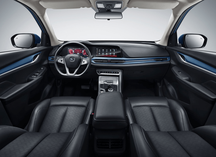 内饰方面,长安CS55纯电版纯电版同样采用了家族式设计语言,为了体现其新能源车型的身份,原车内的金属样式装饰面板替换成为蓝色装饰面板。10英寸的全液晶仪表以及10.25英寸触控中控屏连为一体,为内饰增添了一丝科技感。